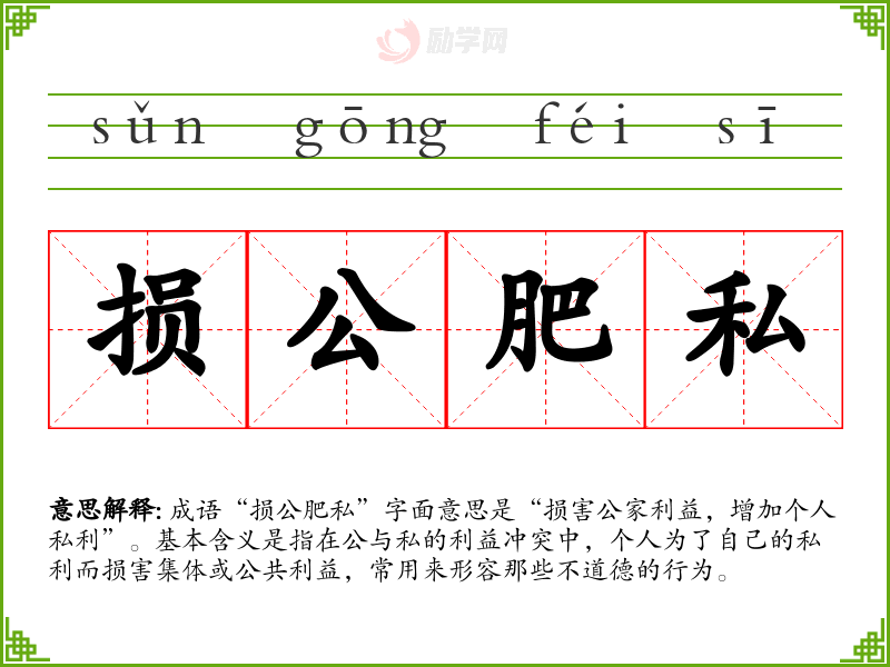 成语“损公肥私”字面意思是“损害公家利益,增加****”。基本含义是指在公与私的利益冲突中,个人为了自己的私利而损害集体或公共利益,常用来形容那些不道德的行为。