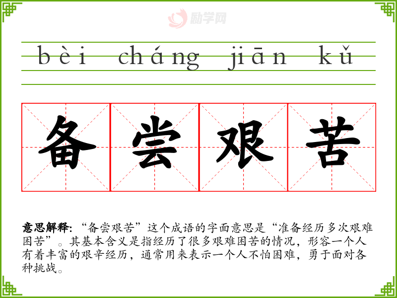 “备尝艰苦”这个成语的字面意思是“准备经历多次艰难困苦”。其基本含义是指经历了很多艰难困苦的情况,形容一个人有着丰富的艰辛经历,通常用来表示一个人不怕困难,勇于面对各种挑战。