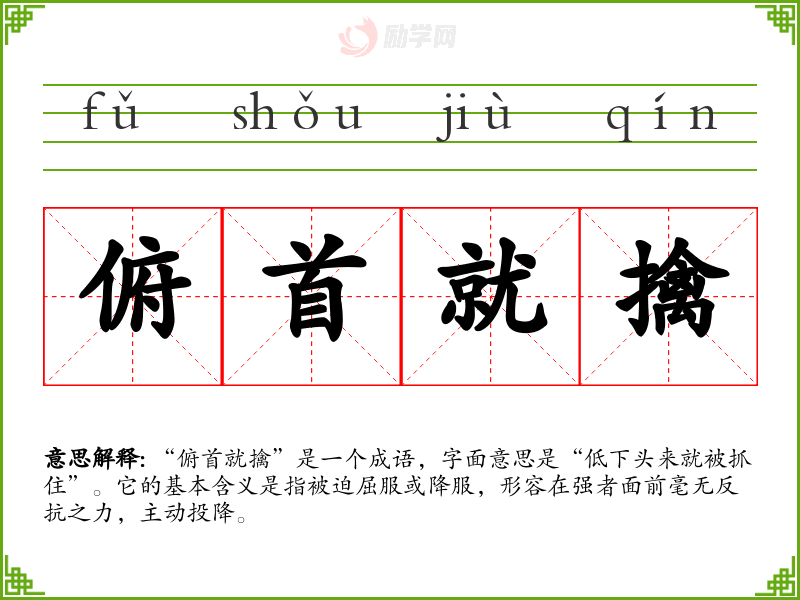 “俯首就擒”是一个成语,字面意思是“低下头来就被抓住”。它的基本含义是指被迫屈服或降服,形容在强者面前毫无反抗之力,主动投降。