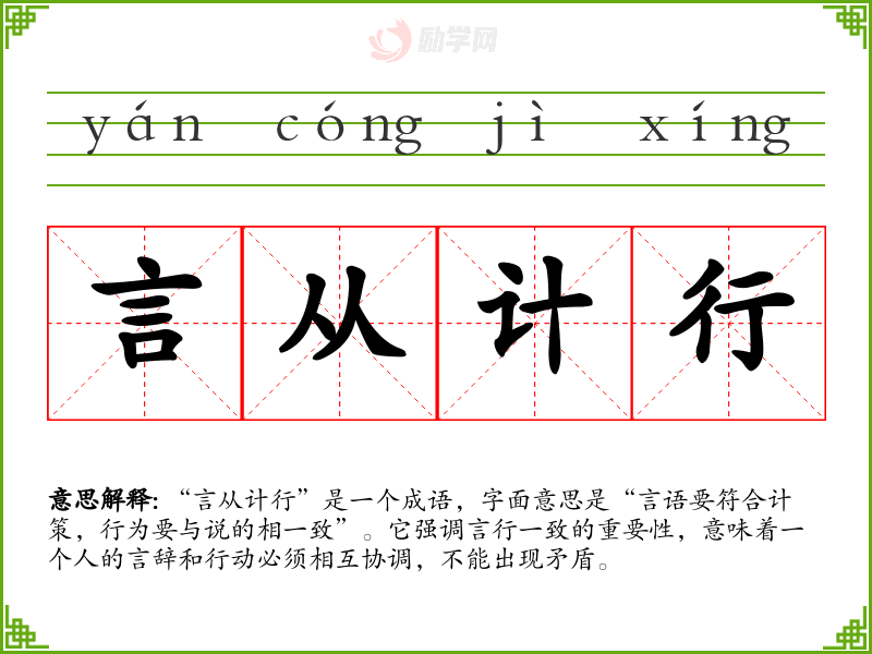 通过对“言从计行”的学,我更加理解了言行一致的重要性。这不仅是个人修养的体现,也是社会交往的基本准则。在语言学和表达中,理解和运用这一成语,可以帮助我更好地与他人沟通,增强表达的说服力。