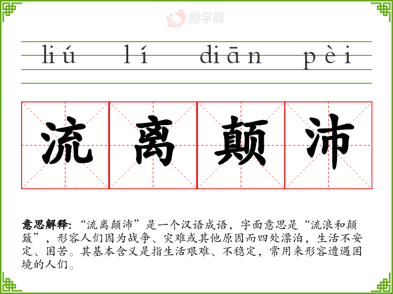 “流离颠沛”是一个汉语成语,字面意思是“流浪和颠簸”,形容人们因为战争、灾难或其他原因而四处漂泊,生活不安定、困苦。其基本含义是指生活艰难、不稳定,常用来形容遭遇困境的人们。