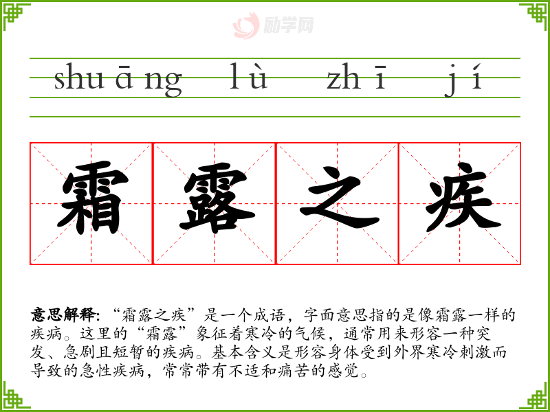 通过对“霜露之疾”的学,我认识到成语不仅是语言的工具,更是文化的载体。它们承载着历史、情感与社会观念,对我的语言学和表达能力有着重要的启发作用。这一成语提醒我在生活中关注健康,尤其是在气候变化时,保持警觉。