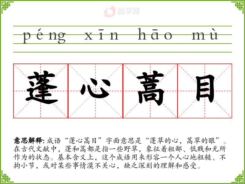 - 演讲:在演讲中,可以借用此成语来警示听众,不要做一个“蓬心蒿目”的人,要追求更高的精神境界。