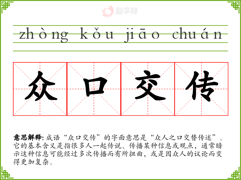 在英语中,与“众口交传”相似的表达可能是“word of mouth”,强调口头传播的方式。但两者在使用频率和文化背景上有细微差别,中文成语更加强调传播过程中的多元解读和可能的扭曲。