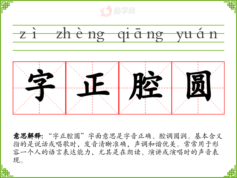 “字正腔圆”字面意思是字音正确、腔调圆润。基本含义指的是说话或唱歌时,发音清晰准确,声调和谐优美。常常用于形容一个人的语言表达能力,尤其是在朗读、演讲或演唱时的声音表现。