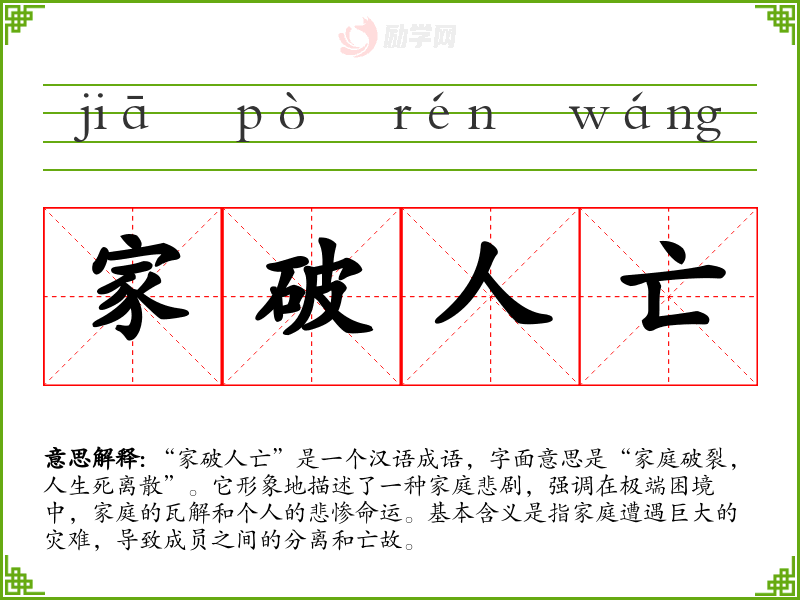 在生活中,我曾在朋友经历家庭变故时使用过这个成语来表达我的同情与关怀。看到他因父母离婚而痛苦不已,我深感“家破人亡”所带来的悲剧,让我更加珍视自己的家庭关系。