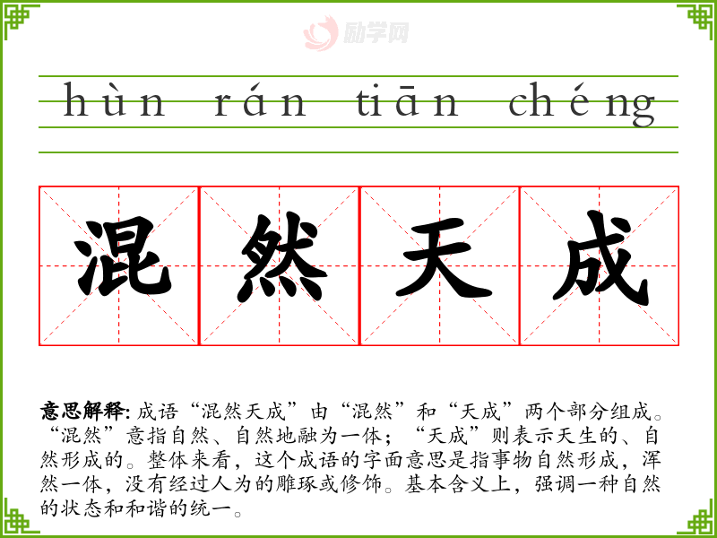 通过对“混然天成”的学与分析,我认识到这一成语不仅仅是对自然美的赞美,更是对生活中自然状态的追求。在语言学与表达中,理解成语的深层含义能够丰富我们的表达方式,使我们更好地传达情感与思想。