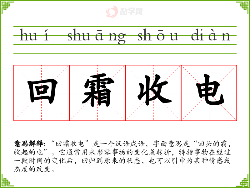 - 反义成语:一去不复返、不可逆转。这些成语强调变化的不可逆性,与“回霜收电”的回归含义相对立。