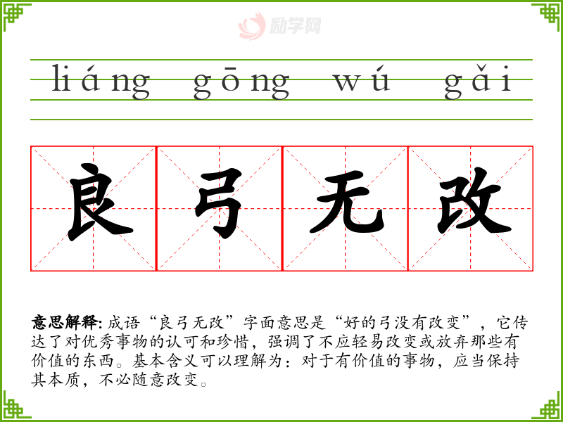 成语“良弓无改”字面意思是“好的弓没有改变”,它传达了对优秀事物的认可和珍惜,强调了不应轻易改变或放弃那些有价值的东西。基本含义可以理解为:对于有价值的事物,应当保持其本质,不必随意改变。