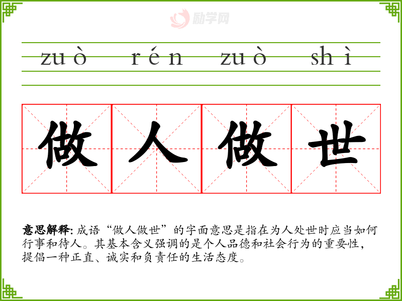 成语“做人做世”的字面意思是指在为人处世时应当如何行事和待人。其基本含义强调的是个人品德和社会行为的重要性,提倡一种正直、诚实和负责任的生活态度。