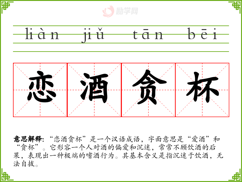 “恋酒贪杯”这四个字让我联想到那些在酒桌上畅饮的场景,也让我想到沉迷于酒精带来的短暂快乐与随之而来的痛苦。它提醒我在生活中要保持理智,避免沉迷于任何事物。