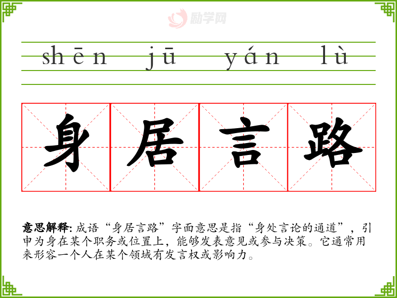 成语“身居言路”字面意思是指“身处言论的通道”,引申为身在某个职务或位置上,能够发表意见或参与决策。它通常用来形容一个人在某个领域有发言权或影响力。