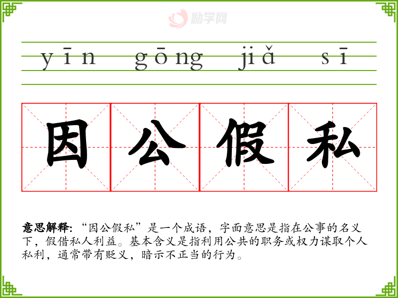 - 演讲:在公共演讲或反腐倡廉的主题演讲中,使用“因公假私”可以强调需要抵制不正之风。