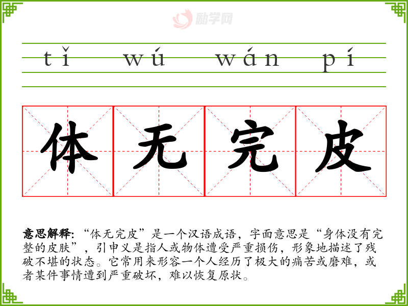 通过对“体无完皮”的学,我深刻认识到它在语言学中的重要性。这个成语不仅丰富了我的词汇量,也让我在表达情感和描述情境时,有了更深刻的理解和更具表现力的方式。它提醒我关注那些经历过磨难的人,以及在生活中坚韧不拔的精神。