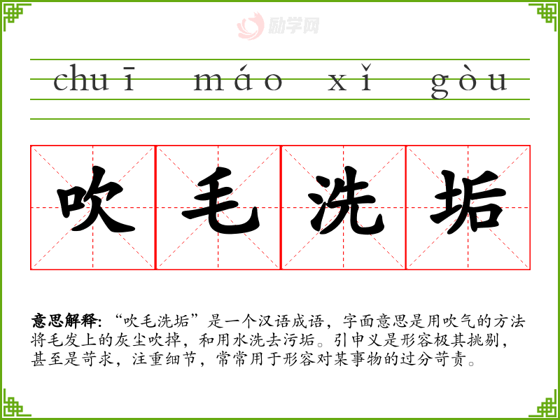 “吹毛洗垢”是一个汉语成语,字面意思是用吹气的方法将毛发上的灰尘吹掉,和用水洗去污垢。引申义是形容极其挑剔,甚至是苛求,注重细节,常常用于形容对某事物的过分苛责。