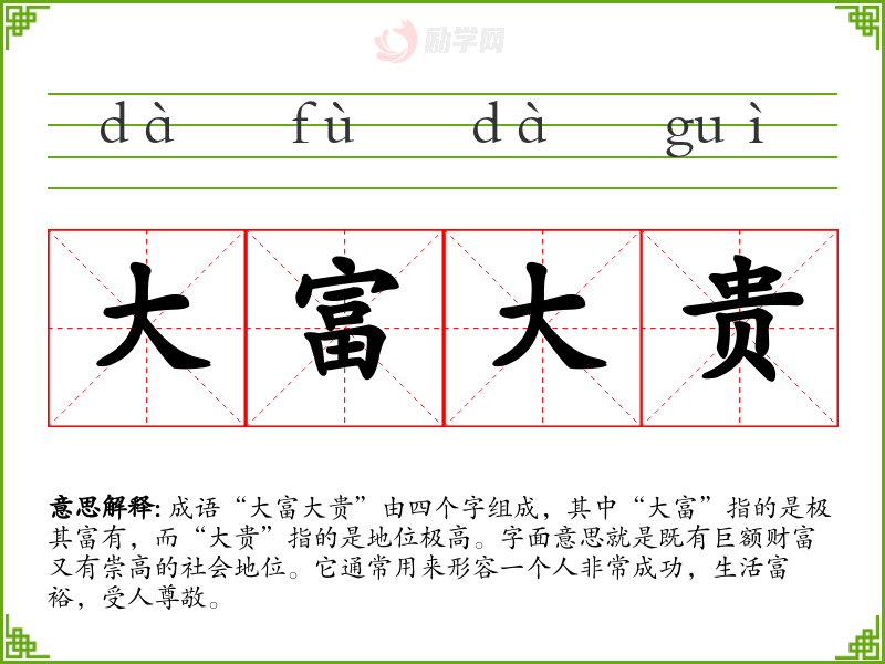 通过对“大富大贵”的学,我深刻认识到这个成语不仅仅是描述财富和地位的表面意思,更反映了人们对成功的追求与期待。在我的语言学和表达中,这个成语提醒我关注内外兼修,追求的不仅是物质的富裕,还有精神的充实。