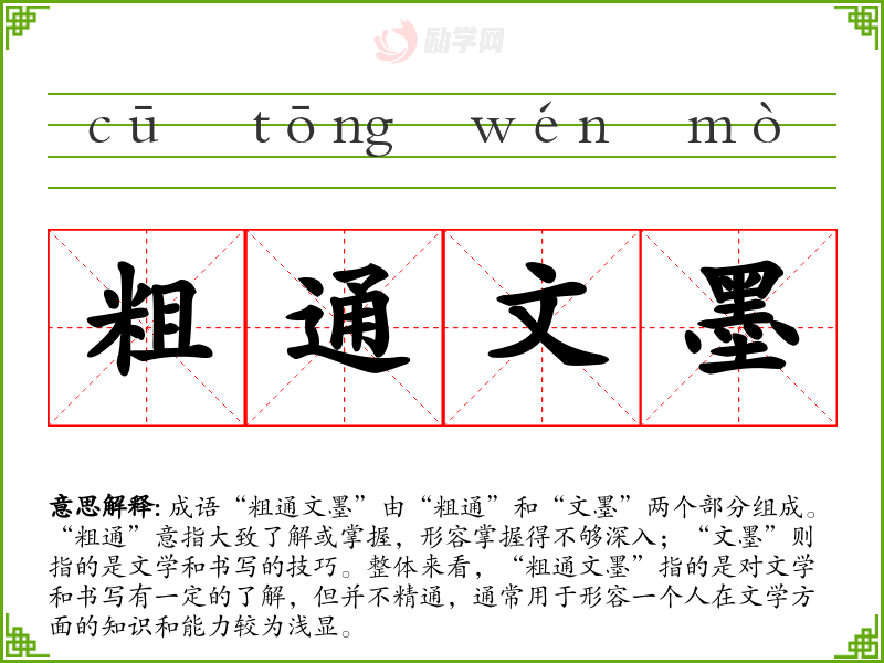 - 文学作品:在描述某个角色的知识水平时,可能会提到他“粗通文墨”,以此来衬托其局限性。