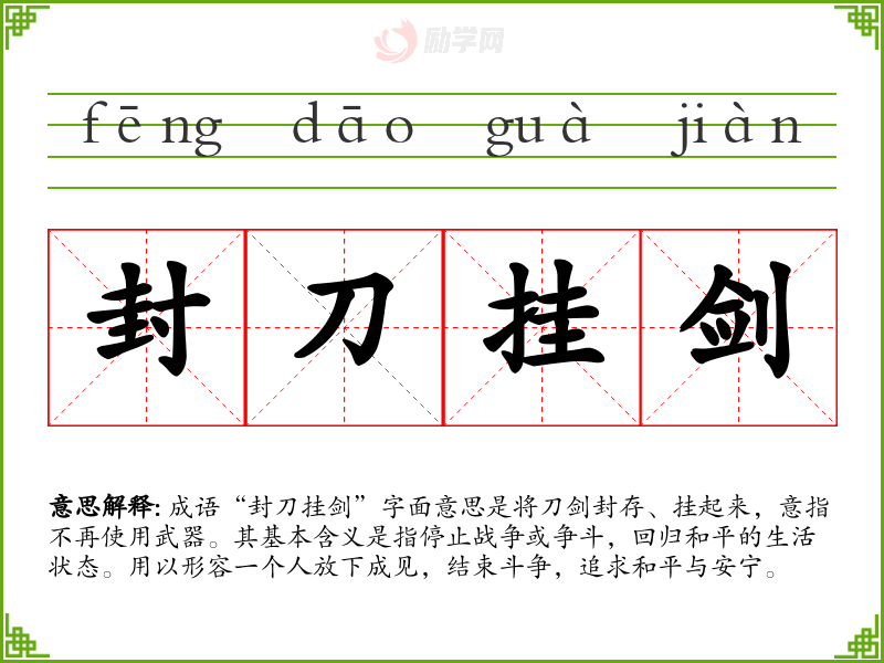 通过对“封刀挂剑”的学*,我深刻感受到和平的珍贵以及放下争斗的重要性。这不仅丰富了我的语言表达,也在思维方式上促使我更加倾向于寻求和解与合作。