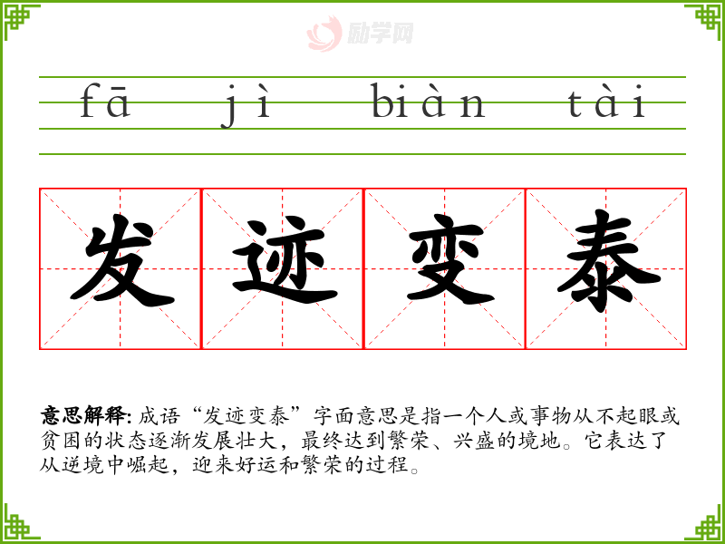 通过对“发迹变泰”的学,我更加理解了成功不仅仅是机遇,更是努力的结果。这一成语在我的语言学和表达中具有重要意义,鼓励我在面对挑战时不放弃追求自己的目标。