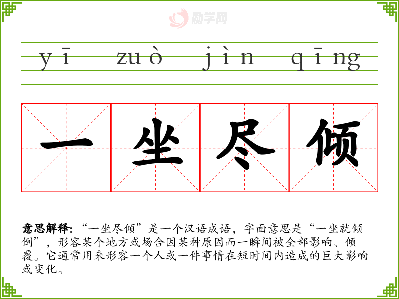 “一坐尽倾”是一个汉语成语,字面意思是“一坐就倾倒”,形容某个地方或场合因某种原因而一瞬间被全部影响、倾覆。它通常用来形容一个人或一件事情在短时间内造成的巨大影响或变化。