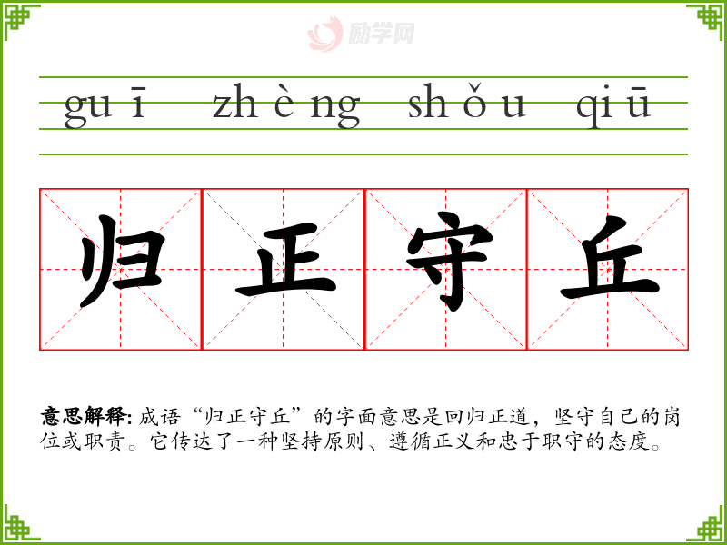 成语“归正守丘”的字面意思是回归正道,坚守自己的岗位或职责。它传达了一种坚持原则、遵循正义和忠于职守的态度。
