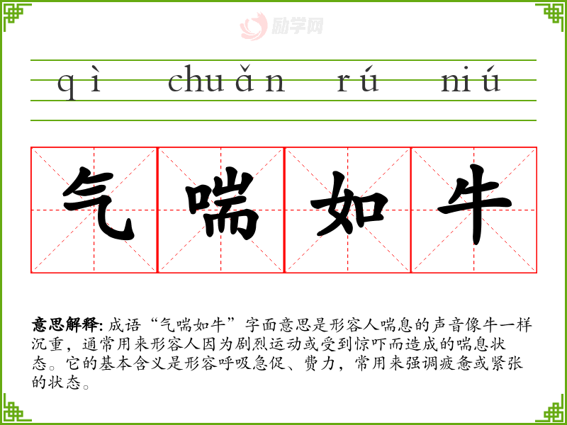 - 反义成语:如“游刃有余”,意指做事情得心应手,毫不费力,与“气喘如牛”形成对比。
