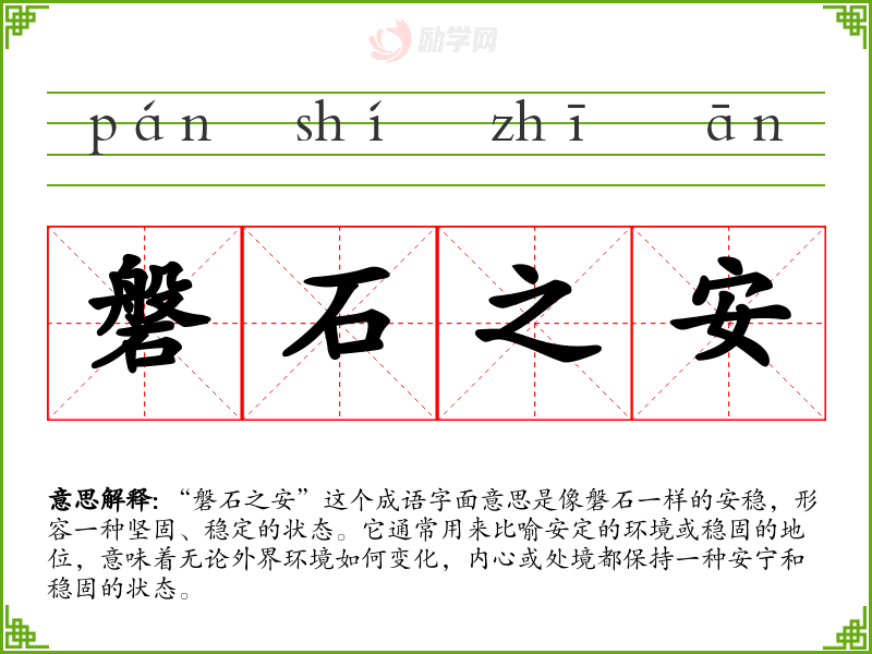 通过对“磐石之安”的学,我认识到在语言学和表达中,成语不仅是词汇的积累,更是文化和智慧的体现。它们在沟通中能够传达深刻的情感和意味,丰富了我的表达方式,也让我在面对生活挑战时,能够保持一种内心的安宁与稳定。