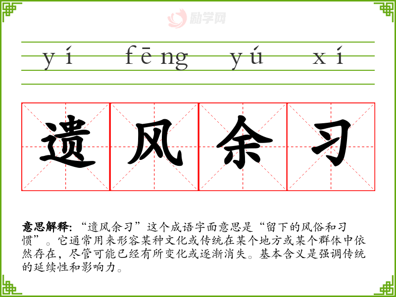 “遗风余”这个成语字面意思是“留下的风俗和惯”。它通常用来形容某种文化或传统在某个地方或某个群体中依然存在,尽管可能已经有所变化或逐渐消失。基本含义是强调传统的延续性和影响力。