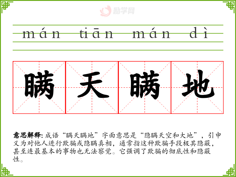 通过对“瞒天瞒地”的学,我深刻认识到诚实和透明的重要性。在语言学和表达中,能够灵活运用成语不仅可以丰富表达,还可以传递更深层次的情感与态度。这个成语提醒我在生活中要警惕欺骗,同时也要努力做一个诚实守信的人。
