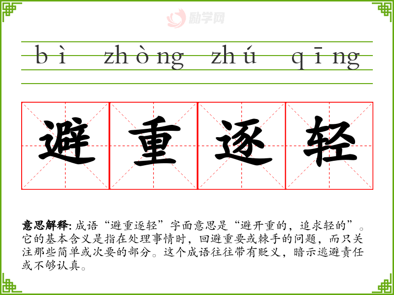 成语“避重逐轻”字面意思是“避开重的,追求轻的”。它的基本含义是指在处理事情时,回避重要或棘手的问题,而只关注那些简单或次要的部分。这个成语往往带有贬义,暗示逃避责任或不够认真。