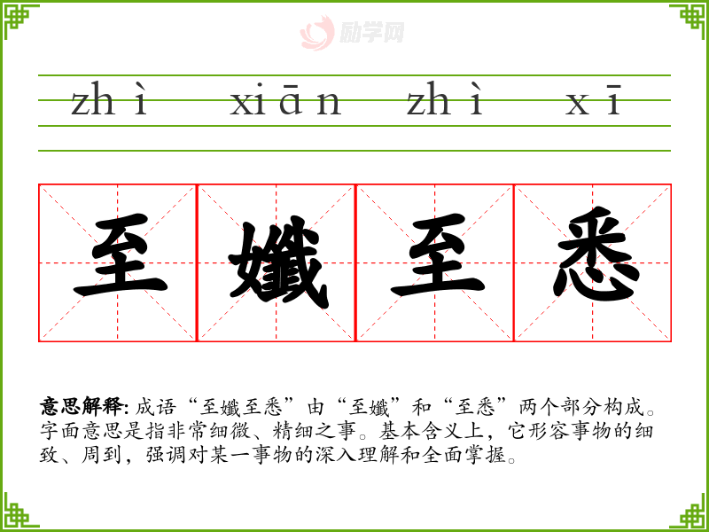 通过对“至孅至悉”的学习,我更加认识到细致与周到在沟通与表达中的重要性。在语言学习和日常交流中,能够深入理解每个词语的含义及其使用场景,不仅能提高表达的准确性,还能增强与他人的沟通效果。这一成语不仅丰富了我的词汇,也让我更加关注生活中的细节,提升了自身的思维深度。