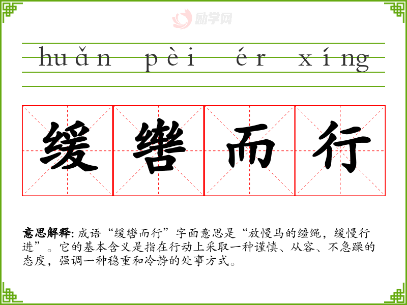 成语“缓辔而行”字面意思是“放慢马的缰绳,缓慢行进”。它的基本含义是指在行动上采取一种谨慎、从容、不急躁的态度,强调一种稳重和冷静的处事方式。