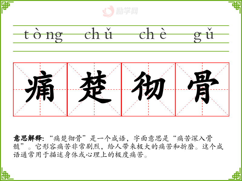 “痛楚彻骨”是一个成语,字面意思是“痛苦深入骨髓”。它形容痛苦非常剧烈,给人带来极大的痛苦和折磨。这个成语通常用于描述身体或心理上的极度痛苦。