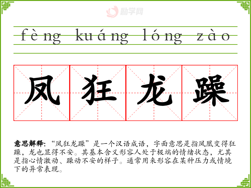 在**文化中,凤和龙都是象征吉祥、高贵的动物,因而“凤狂龙躁”不仅表达了情绪的失控,也反映了人们对理想状态的向往与现实的冲突。在现代社会,随着压力的增加,这一成语的适用性更为广泛,常用于描述职场、学业等方面的焦虑。