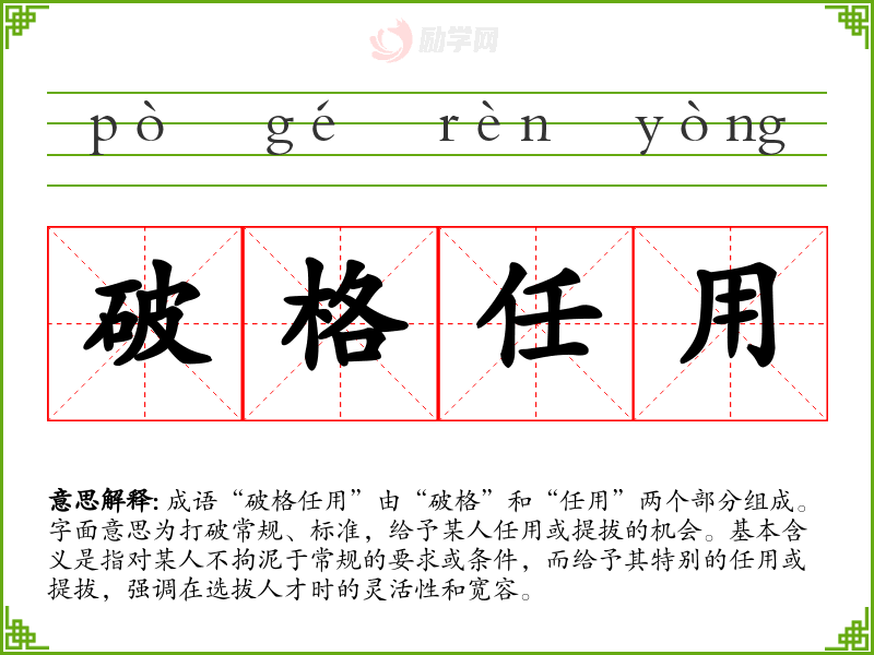 成语“破格任用”由“破格”和“任用”两个部分组成。字面意思为打破常规、标准,给予某人任用或提拔的机会。基本含义是指对某人不拘泥于常规的要求或条件,而给予其特别的任用或提拔,强调在选拔人才时的灵活性和宽容。