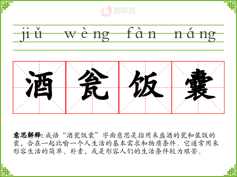 成语“酒瓮饭囊”字面意思是指用来盛酒的瓮和装饭的囊,合在一起比喻一个人生活的基本需求和物质条件。它通常用来形容生活的简单、朴素,或是形容人们的生活条件较为艰苦。