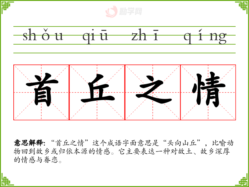 “首丘之情”这个成语字面意思是“头向山丘”,比喻动物回到故乡或归依本源的情感。它主要表达一种对故土、故乡深厚的情感与眷恋。