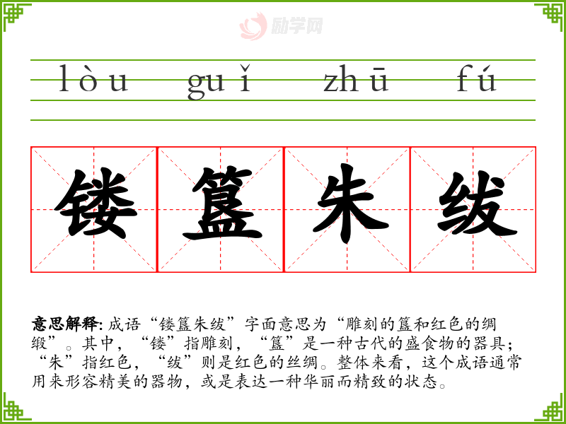“镂簋朱绂”出自《尚书·周书》,原文为“周公之礼,镂簋朱绂”。这一成语反映了周代礼仪之美,尤其是周公在礼制方面的贡献,体现了古代社会对礼仪和物质文化的重视。