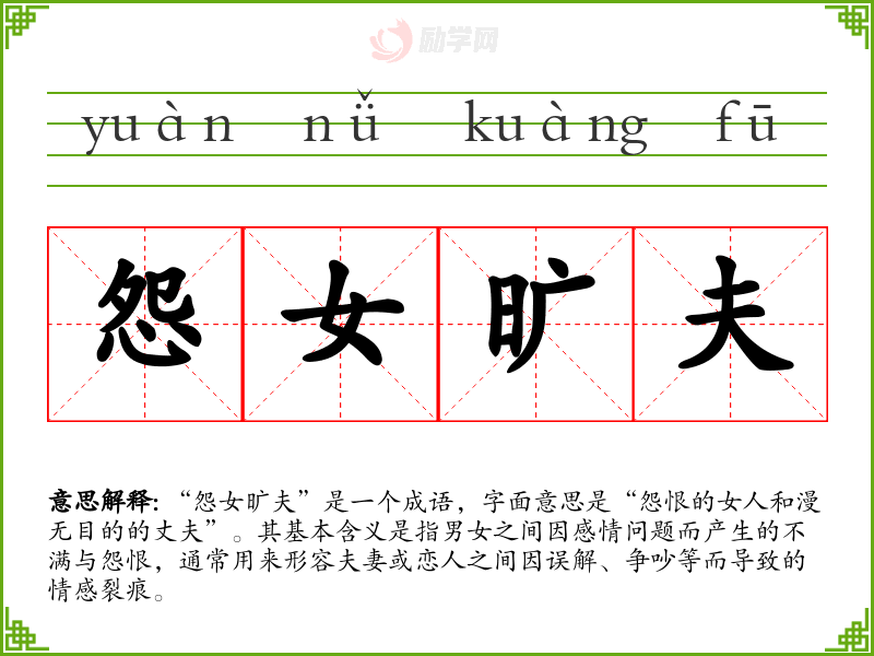 “怨女旷夫”是一个成语,字面意思是“怨恨的女人和漫无目的的丈夫”。其基本含义是指男女之间因感情问题而产生的不满与怨恨,通常用来形容夫妻或恋人之间因误解、争吵等而导致的情感裂痕。