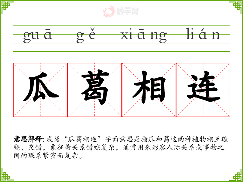 成语“瓜葛相连”字面意思是指瓜和葛这两种植物相互缠绕、交错,象征着关系错综复杂,通常用来形容人际关系或事物之间的联系紧密而复杂。