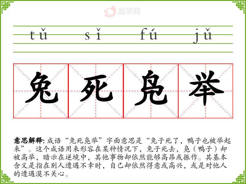 成语“兔死凫举”字面意思是“兔子死了,鸭子也被举起来”。这个成语用来形容在某种情况下,兔子死去,凫(鸭子)却被高举,暗示在逆境中,其他事物却依然能够高昂或振作。其基本含义是指在别人遭遇不幸时,自己却依然得意或高兴,或是对他人的遭遇漠不关心。