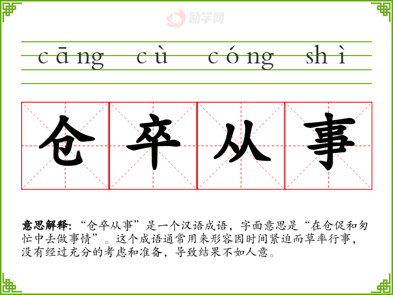 该成语出自《左传·僖公二十三年》:“仓卒从事,吾不知也。”这里的“仓卒”意指匆忙、急迫,表示没有充分的准备时间,而“从事”则是指进行某项活动或工作。成语的形成反映了古人对于行事应谨慎周全的态度。