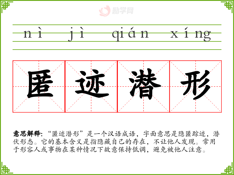 通过对“匿迹潜形”的学习,我认识到这个成语不仅仅是字面上的隐蔽,它还反映了人们在现代社会中对隐私、低调和自我保护的深刻思考。它在语言学习和表达中提醒我们,适度的隐蔽与适度的展示同样重要,这对于个人的成长与人际交往都是一种平衡的艺术。