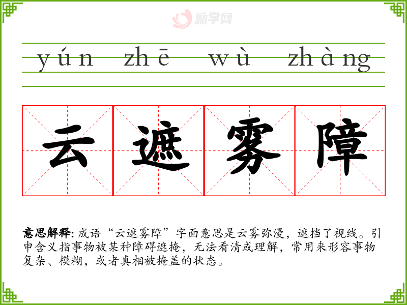 在一次学术讨论中,我们探讨了某个社会现象的原因。当时我用“云遮雾障”来形容公众对这一现象的误解与模糊认识,成功引起了大家的共鸣,使讨论更加深入。