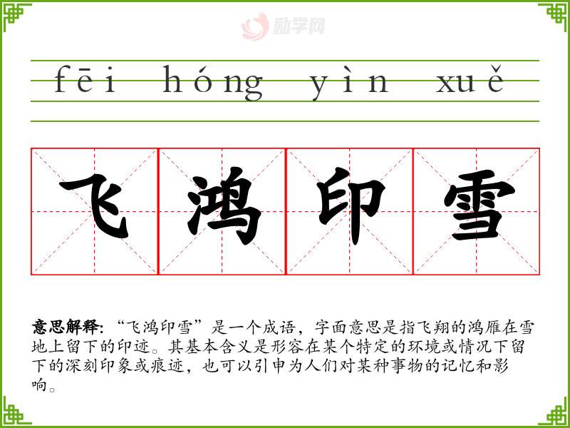 “飞鸿印雪”是一个成语,字面意思是指飞翔的鸿雁在雪地上留下的印迹。其基本含义是形容在某个特定的环境或情况下留下的深刻印象或痕迹,也可以引申为人们对某种事物的记忆和影响。