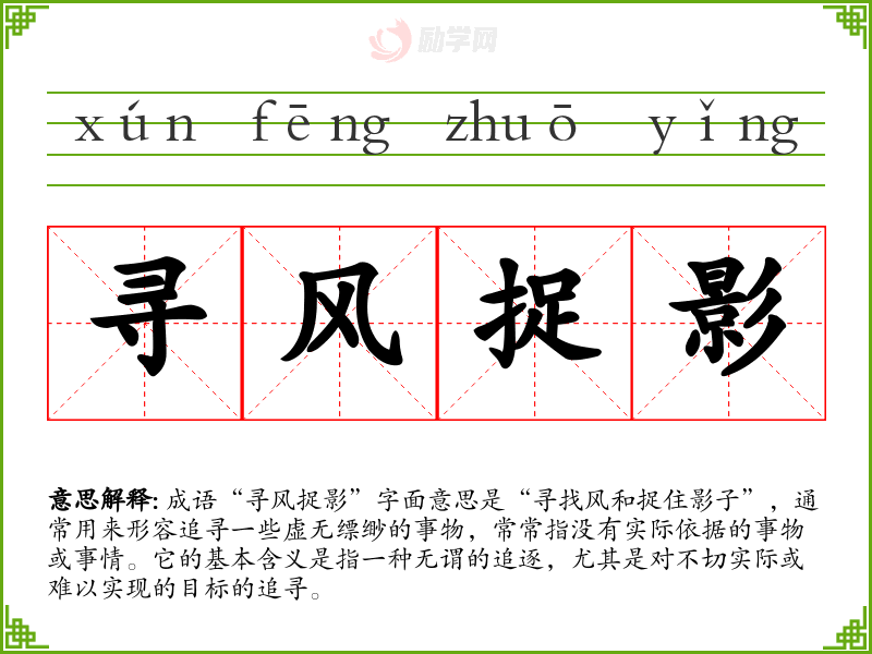 成语“寻风捉影”字面意思是“寻找风和捉住影子”,通常用来形容追寻一些虚无缥缈的事物,常常指没有实际依据的事物或事情。它的基本含义是指一种无谓的追逐,尤其是对不切实际或难以实现的目标的追寻。