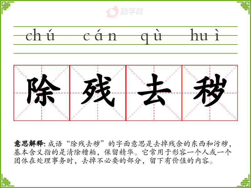 “除残去秽”让我联想到一种清新、整洁的感觉。它传达出一种积极向上的态度,激励人们在生活和工作中去掉负担,追求更高的目标。这种情感上的共鸣使我在表达时更加注重语言的简洁与精炼。