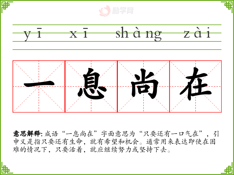 成语“一息尚在”字面意思为“只要还有一口气在”,引申义是指只要还有生命,就有希望和机会。通常用来表达即使在困难的情况下,只要活着,就应继续努力或坚持下去。