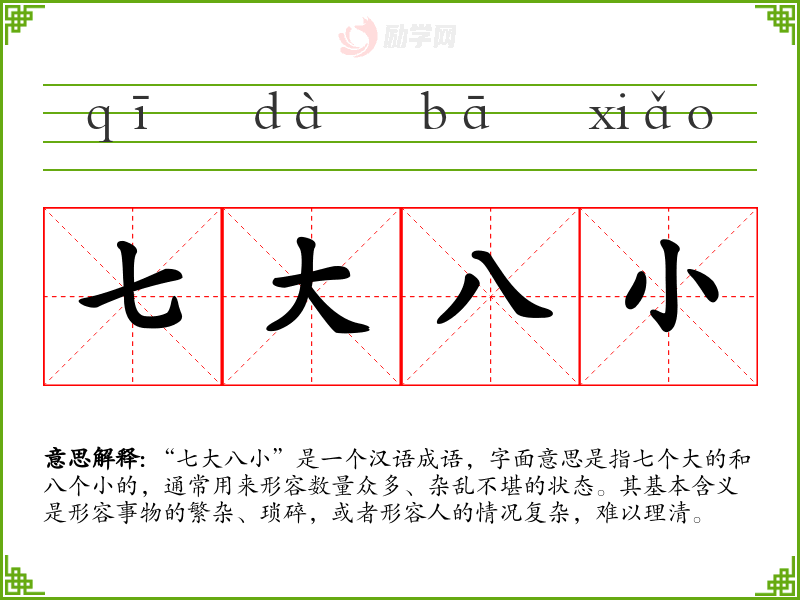 “七大八小”是一个汉语成语,字面意思是指七个大的和八个小的,通常用来形容数量众多、杂乱不堪的状态。其基本含义是形容事物的繁杂、琐碎,或者形容人的情况复杂,难以理清。
