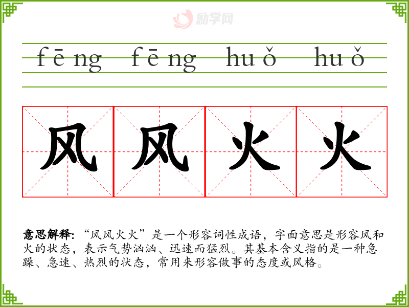 “风风火火”是一个形容词性成语,字面意思是形容风和火的状态,表示气势汹汹、迅速而猛烈。其基本含义指的是一种急躁、急速、热烈的状态,常用来形容做事的态度或风格。